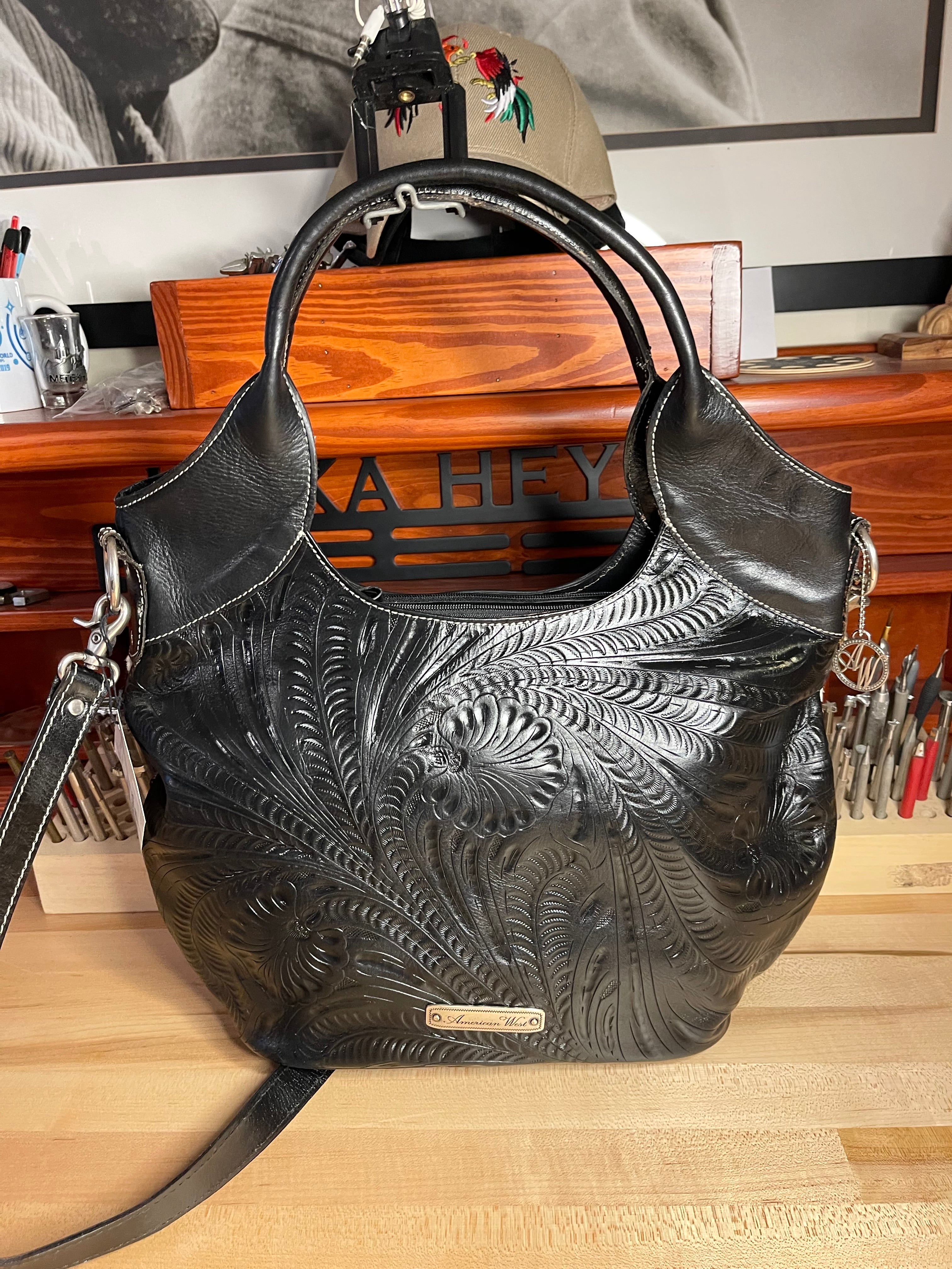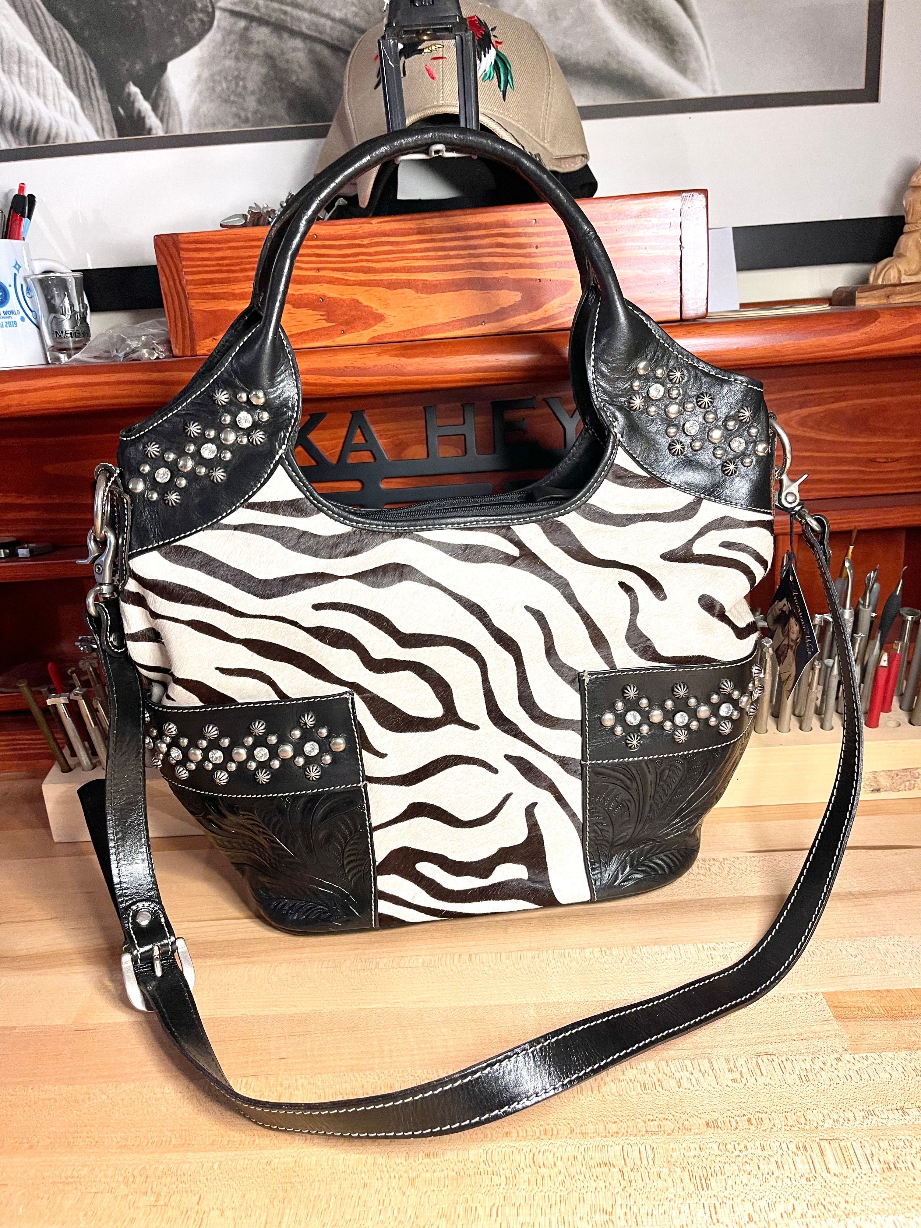Large zip-top tote with 2 shoulder straps and a detachable, adjustable crossbody shoulder strap. 2 front open pockets. Inside has zipper compartment and two pouches. Black and white Zebra printed hair-on cowhide bordered by black leather and accented with a design of various silver spots and sparkling crystals. handbag features a silver signature keepsake and includes a protective storage bag.